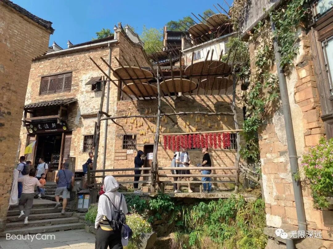 大家玩的不亦樂乎,看了很多美景、燈光秀、手工瓷器、徽式商鋪林立,前店后坊,一幅流動(dòng)的縮寫版“清明上河圖”【深山古村】山窮水復(fù)疑無路,柳暗花明又一村,掛在山腰上的篁嶺村一直隱匿在群山環(huán)繞中,婉約中透著一種仙氣。
